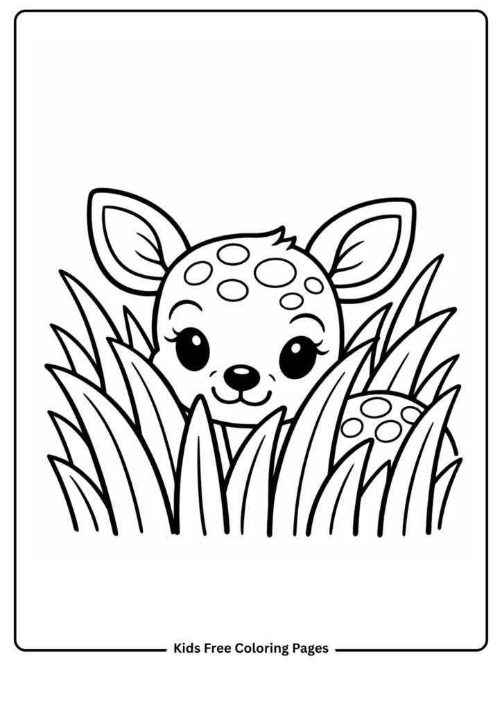 This coloring page features a cute fawn with its iconic white spots, which help it blend into the forest. The fawn is peeking out from tall grass, teaching kids about camouflage and baby animals. The large spots and simple grass make it easy to color.