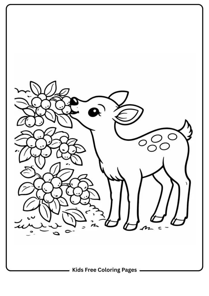 This page shows a deer snacking on berries, teaching kids about deer diets and forest foods. The large berries and simple deer make it easy to color.