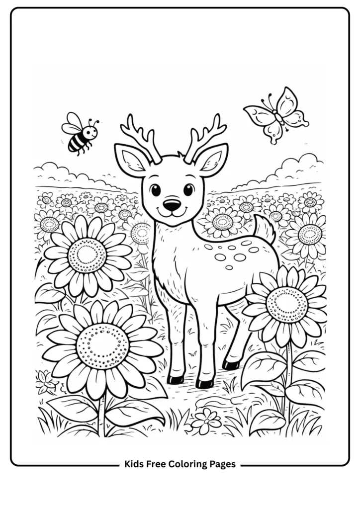 This bright page shows a deer in a field of sunflowers, teaching kids about pollinators and summer habitats. The large sunflowers and simple deer make it fun to color.