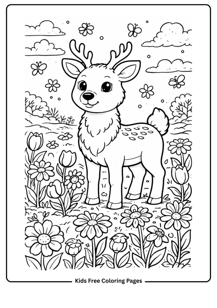 This cheerful page shows a deer in a field of blooming flowers, teaching kids about spring and new growth. The large flowers and simple deer make it easy to color.