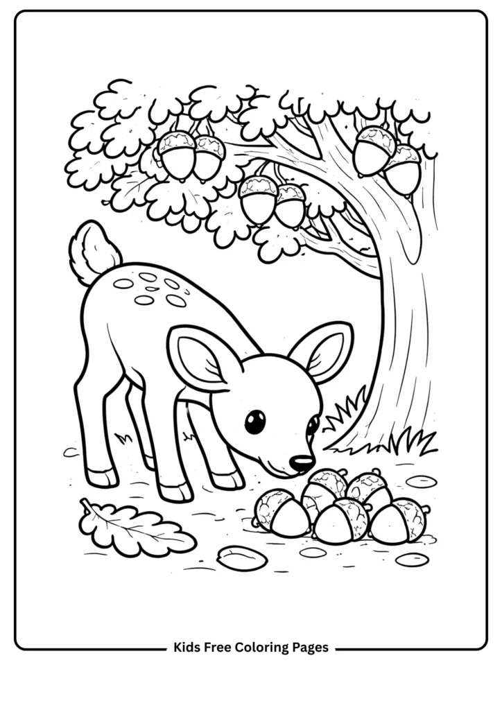 This page shows a deer searching for acorns, teaching kids about forest foods and animal diets. The large acorns and simple deer make it easy to color.