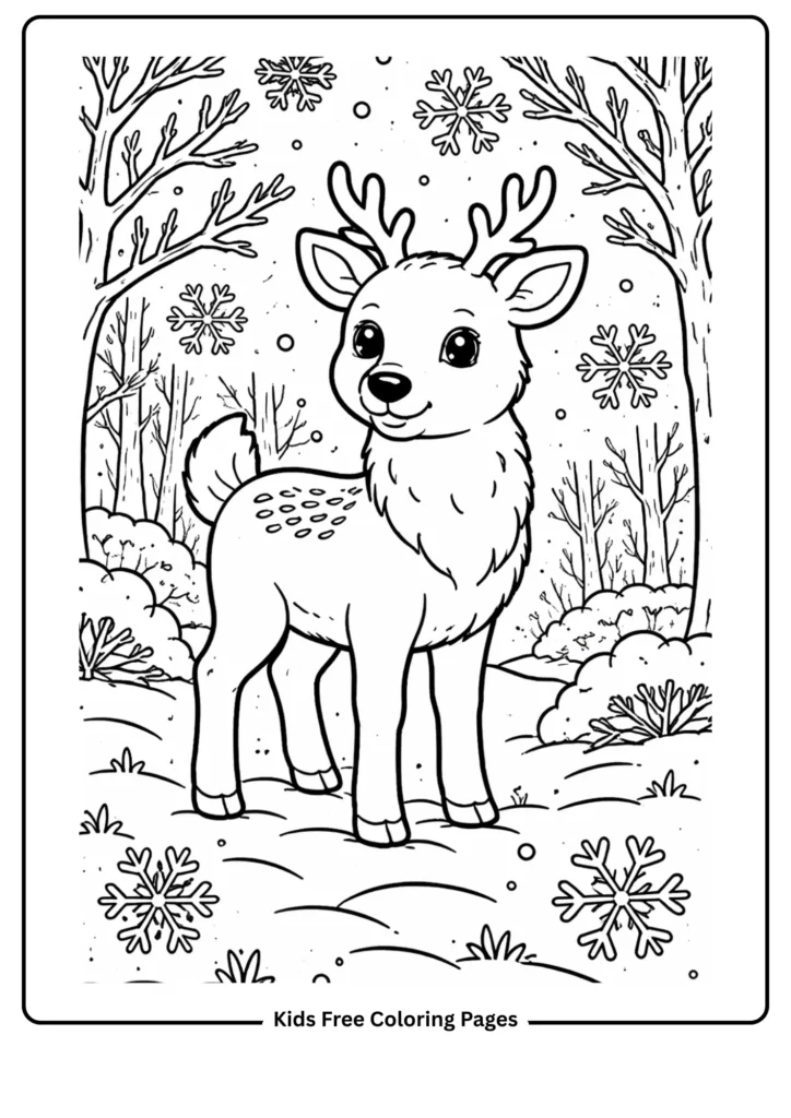 This wintery page shows a deer in the snow, teaching kids about animal adaptations to cold weather. The large snowflakes and simple deer make it easy to color.