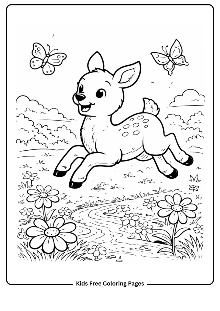 This playful page shows a fawn leaping through a meadow of flowers and butterflies, teaching kids about baby animal behaviors. The large flowers and simple fawn make it fun to color.