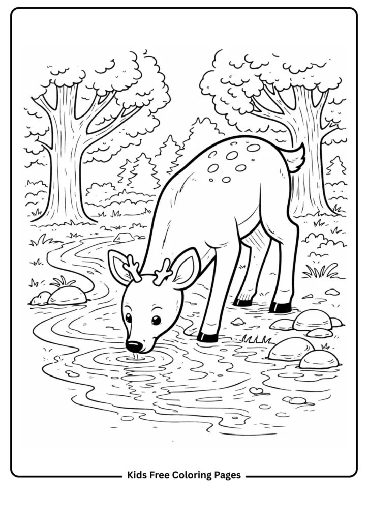 This page shows a deer drinking water from a sparkling stream, teaching kids about how animals stay hydrated. The large deer and simple stream make it easy to color, and the forest background adds context.