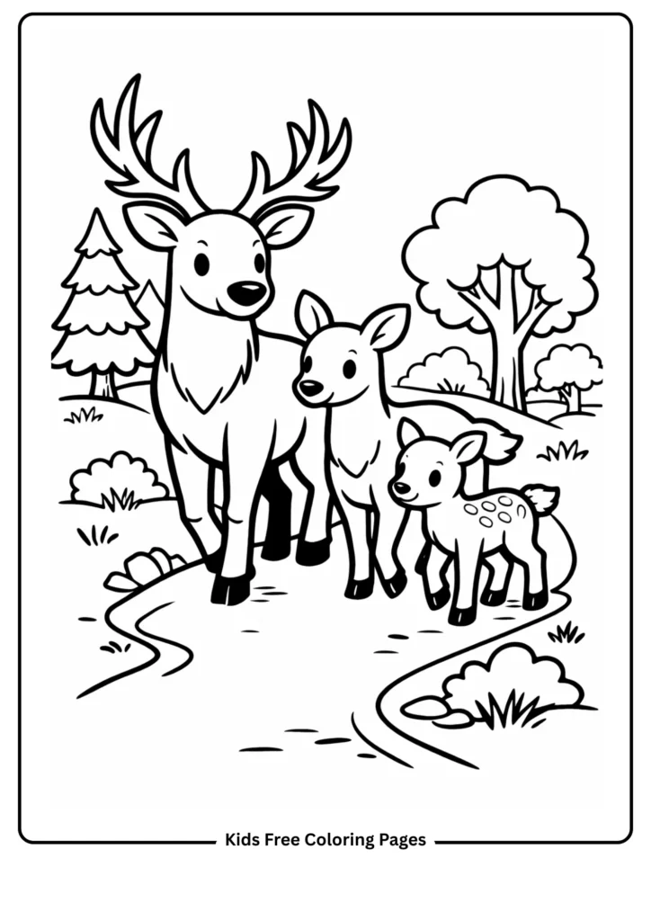 This heartwarming page features a deer family walking together in the forest. The stag, doe, and fawn are different sizes, teaching kids about animal families and forest ecosystems. The simple trees and path make it easy to color.