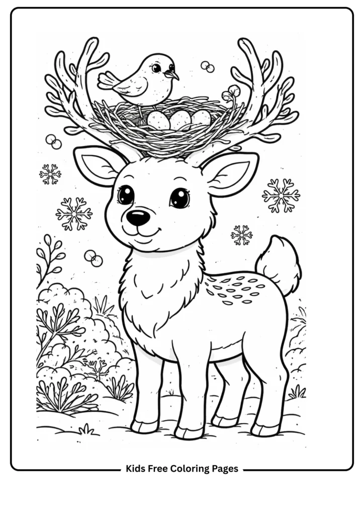 This unique page shows a bird nest tucked in a deer’s antlers, teaching kids about unexpected animal friendships. The large nest and simple deer make it easy to color.