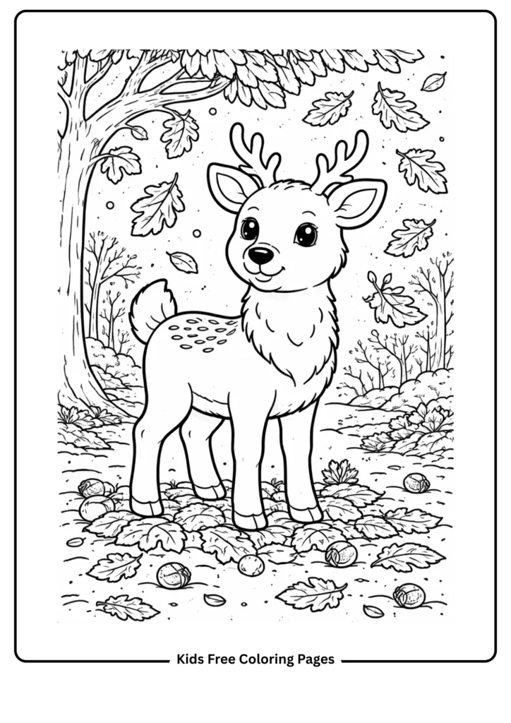 This seasonal page shows a deer in an autumn forest, with leaves falling around it. Kids can learn about seasons and forest habitats. The large leaves and simple deer make it easy to color.