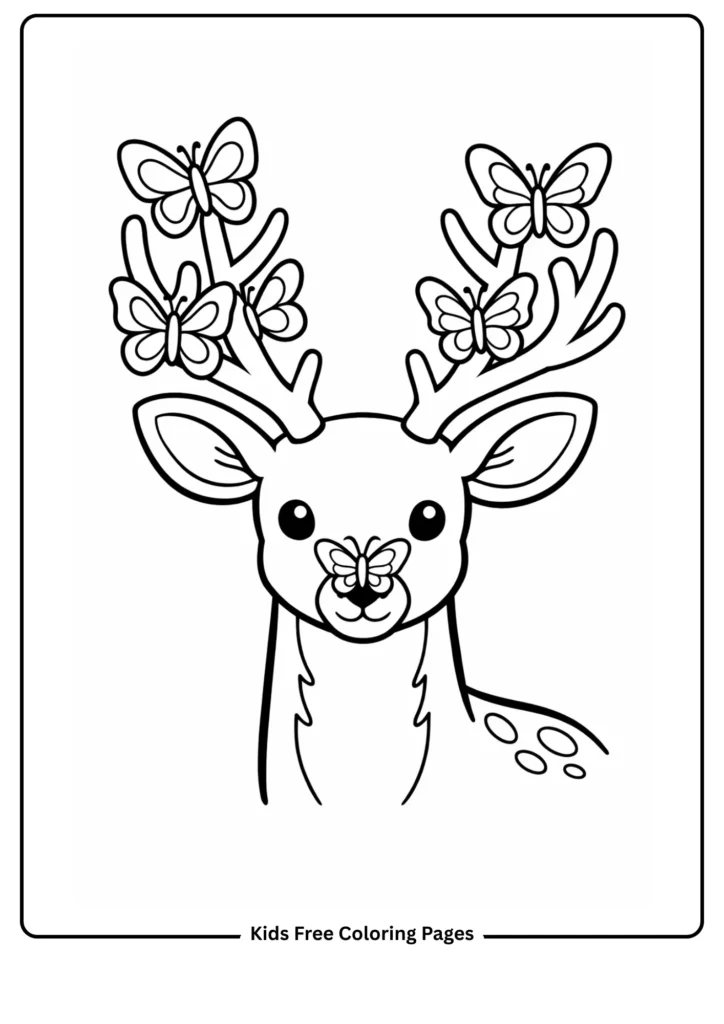 This gentle page shows a deer with colorful butterflies resting on its antlers, teaching kids about pollinators and gentle giants. The large butterflies and simple deer make it easy to color.