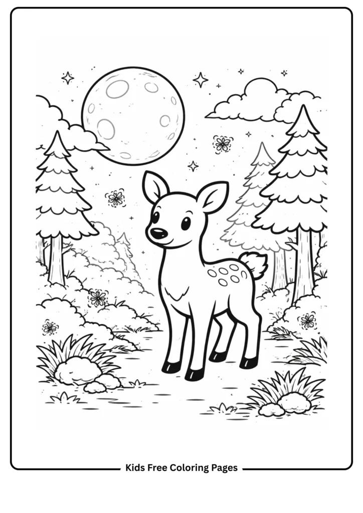 This dreamy page shows a deer in a moonlit forest, teaching kids about nocturnal animals and forest magic. The large moon and simple deer make it easy to color, and the fireflies add sparkle.
