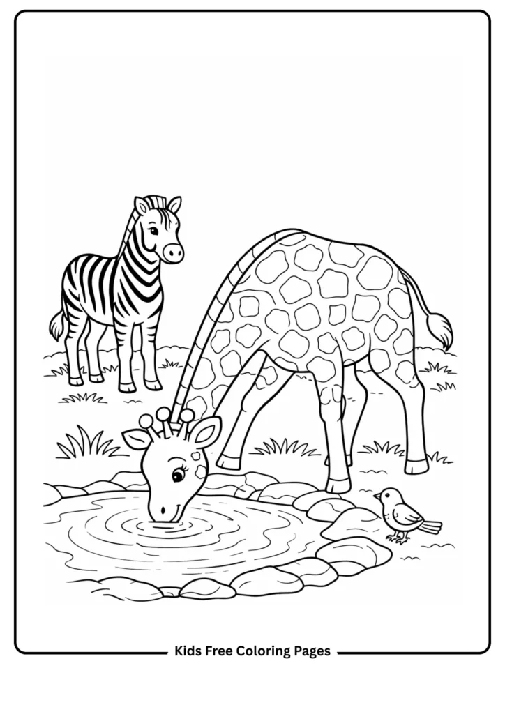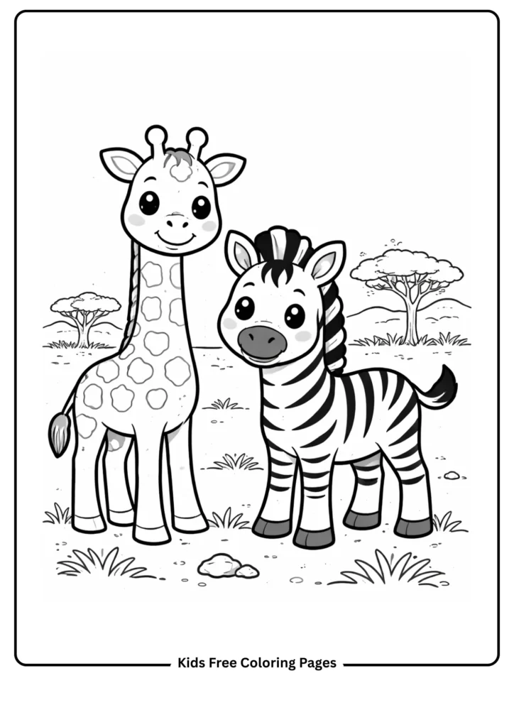 This page shows a giraffe and zebra together, teaching kids about African wildlife friendships. The stripes and spots create a fun contrast, and the simple savanna background completes the scene.