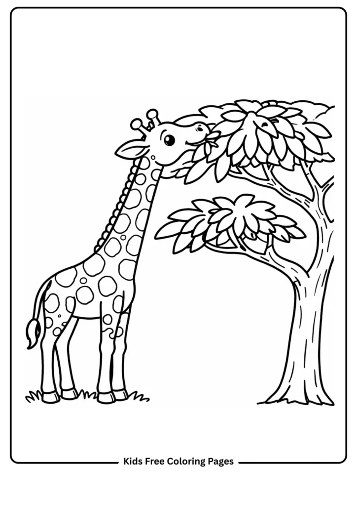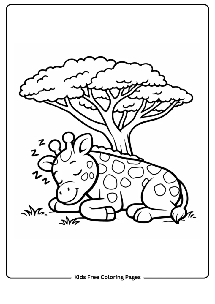 This calming page shows a giraffe sleeping under a tree, teaching kids about how giraffes rest. The tree and giraffe are large and simple, with a serene savanna background.