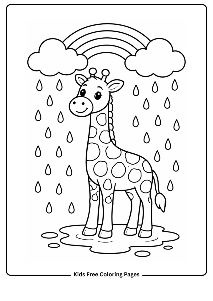 This page shows a giraffe in the rain, teaching kids about weather in the savanna. The raindrops and rainbow add color, and the giraffe’s spots are large and easy to color.