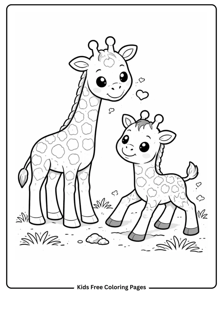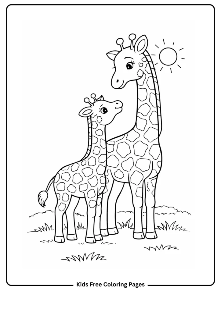 This heartwarming page features a baby giraffe (calf) with its taller mom. The calf is smaller and cutely proportioned, while the mom has a gentle, watchful expression. The savanna background includes simple grass and a sun, teaching kids about giraffe families.