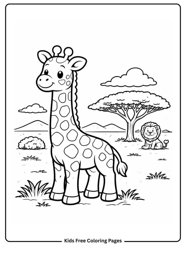 This page teaches kids about predator-prey relationships in a kid-friendly way. The giraffe is tall and alert, while the lion is small and far away, emphasizing safety. The simple savanna background completes the scene.