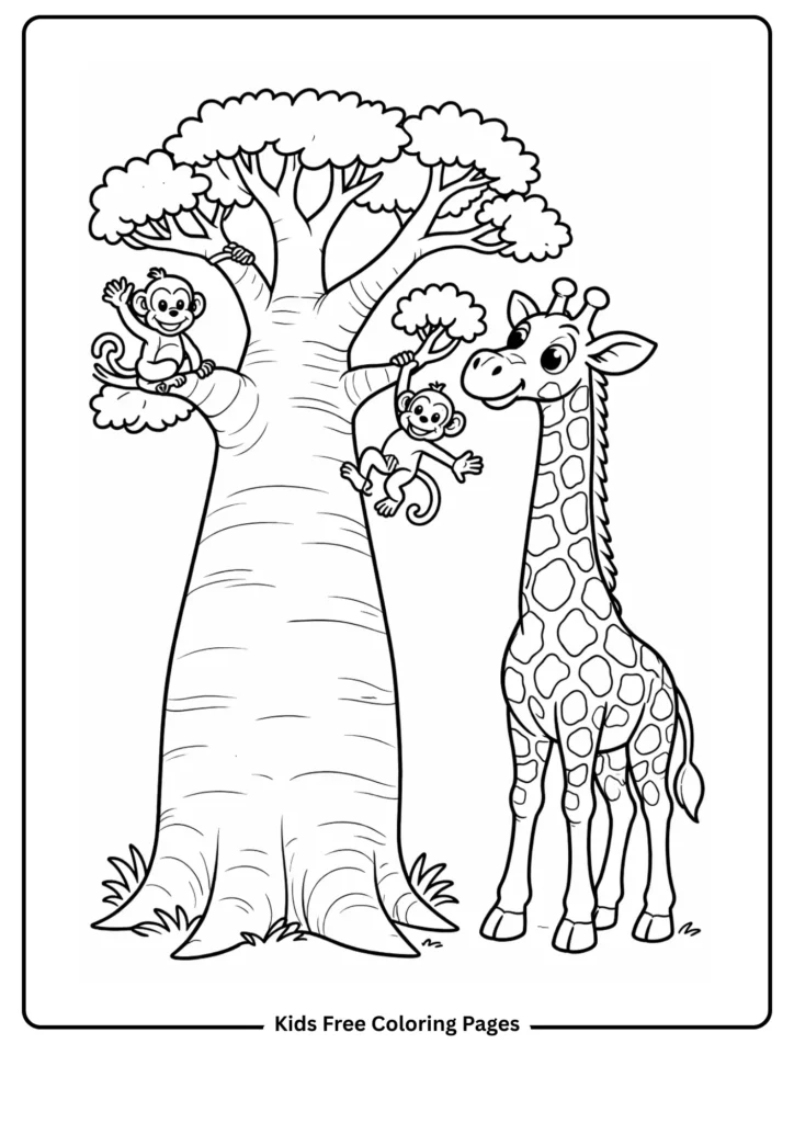 This page shows a giraffe and a baobab tree, teaching kids about African trees and ecosystems. The monkeys in the branches add a playful touch, and the large tree and giraffe are easy to color.