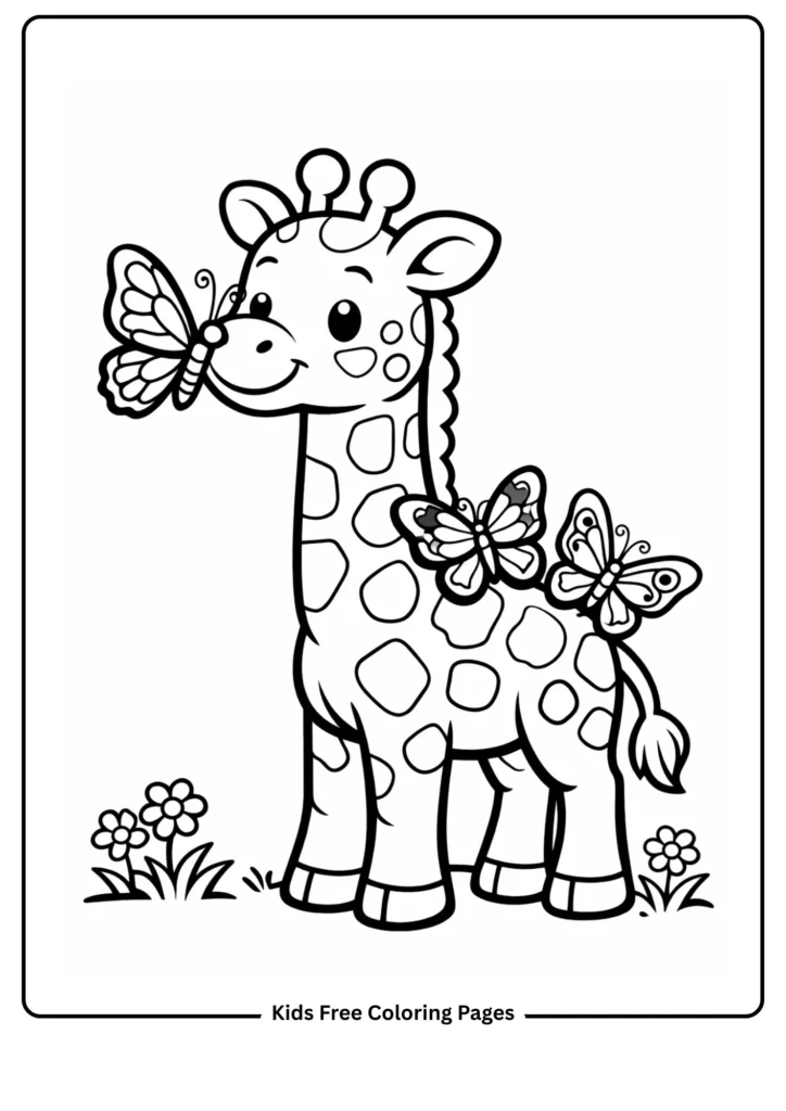 This gentle page shows a giraffe with colorful butterflies resting on it, teaching kids about pollinators and gentle giants. The butterflies are large and simple, and the giraffe has a kind expression.
