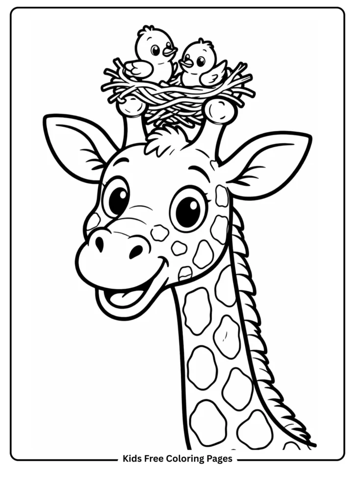 This unique page shows a bird nest in a giraffe’s ossicones, teaching kids about unexpected animal friendships. The giraffe looks surprised but happy, and the nest and eggs are large and simple.
