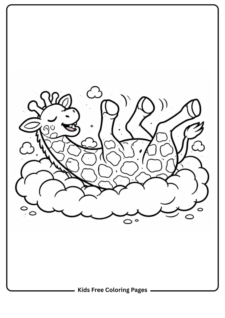 This playful page shows a giraffe taking a dust bath, teaching kids about how animals stay clean. The dust cloud and happy giraffe are large and easy to color.