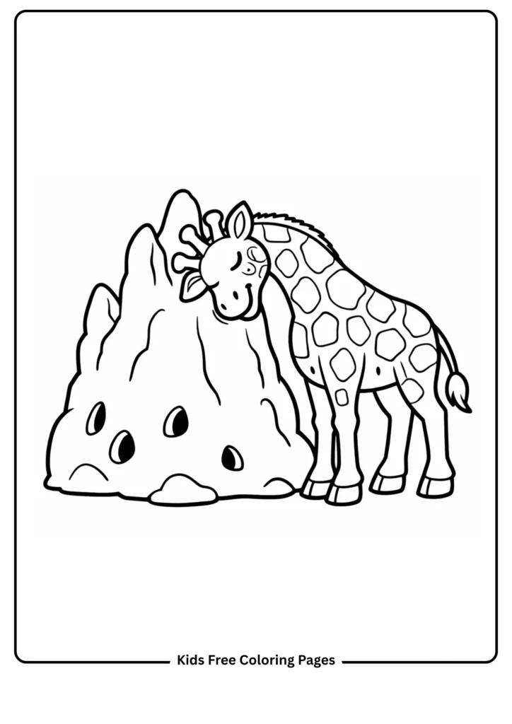 This page shows a giraffe using a termite mound as a scratching post, teaching kids about animal behaviors. The termite mound is large and simple, and the giraffe has a happy expression.