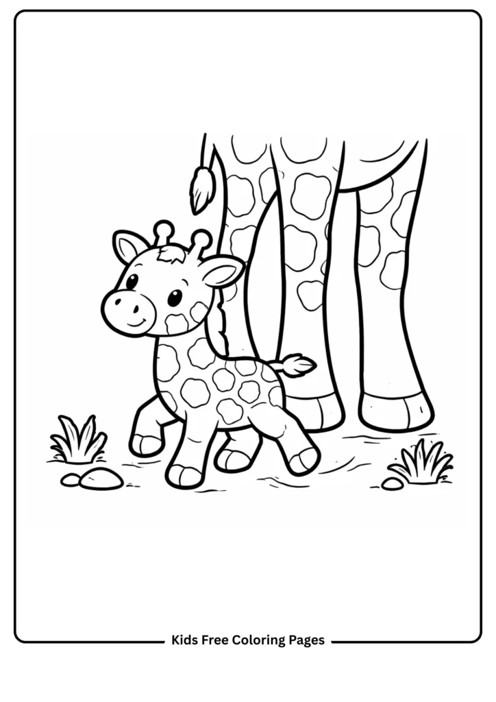 This adorable page shows a baby giraffe taking its first steps, with its mom nearby for support. The wobbly legs and encouraging mom teach kids about animal growth and parental care.