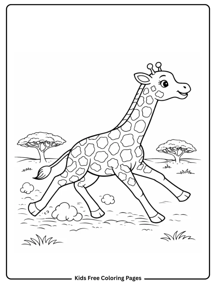 This dynamic page shows a giraffe running with its long legs stretched out. The dust clouds and grass add movement, teaching kids about how giraffes move. The large, flowing shapes make it fun to color.