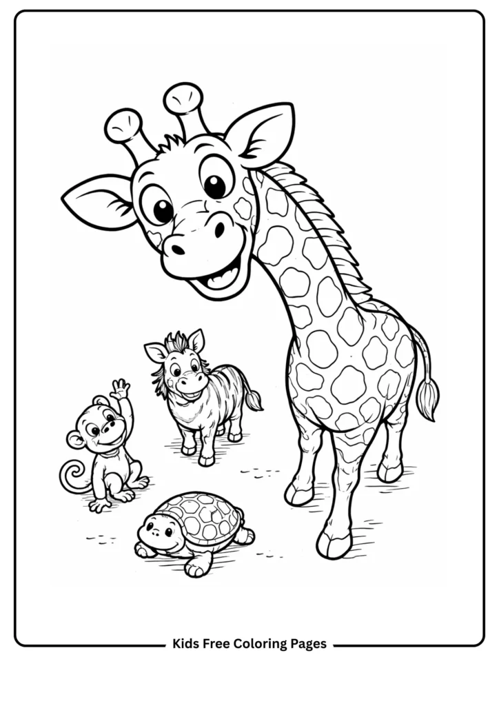This page shows a giraffe towering over other animals, teaching kids about perspective and height. The smaller animals (zebra, monkey, tortoise) are below, looking up. The large giraffe and tiny animals create a fun contrast.