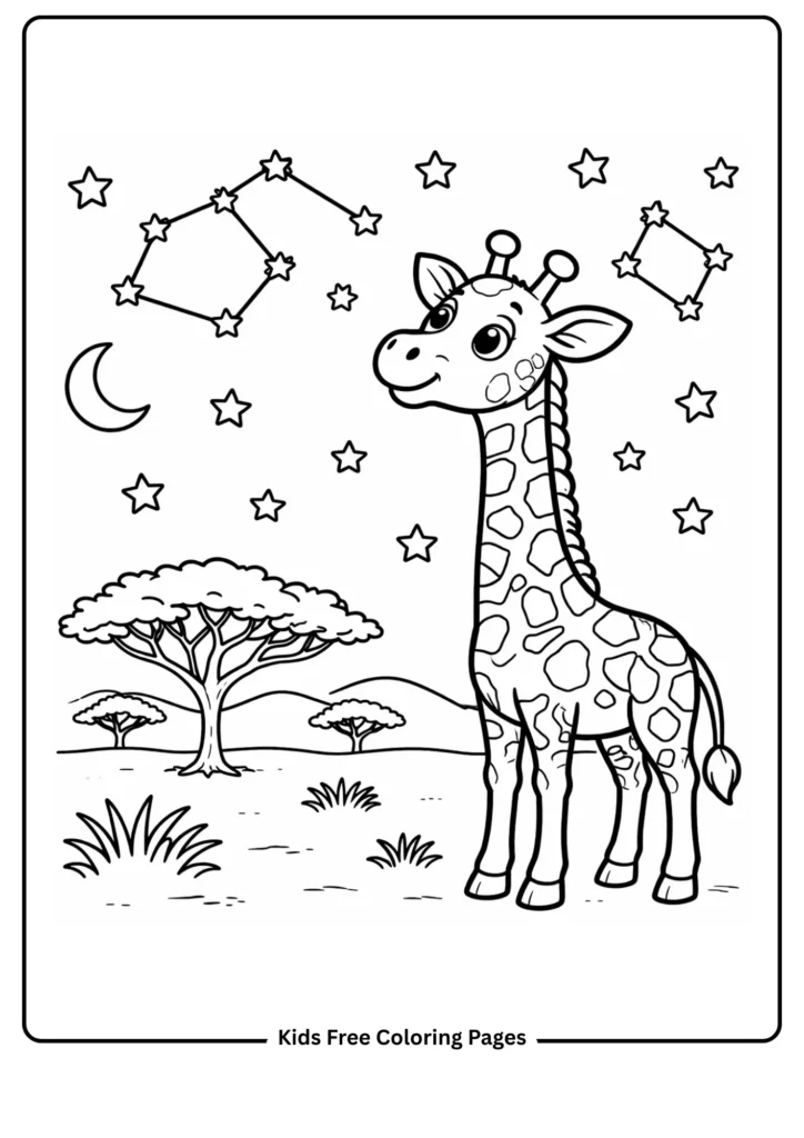 This dreamy page shows a giraffe at night, teaching kids about African skies and constellations. The stars and giraffe are large and easy to color, and the calm scene is perfect for bedtime.