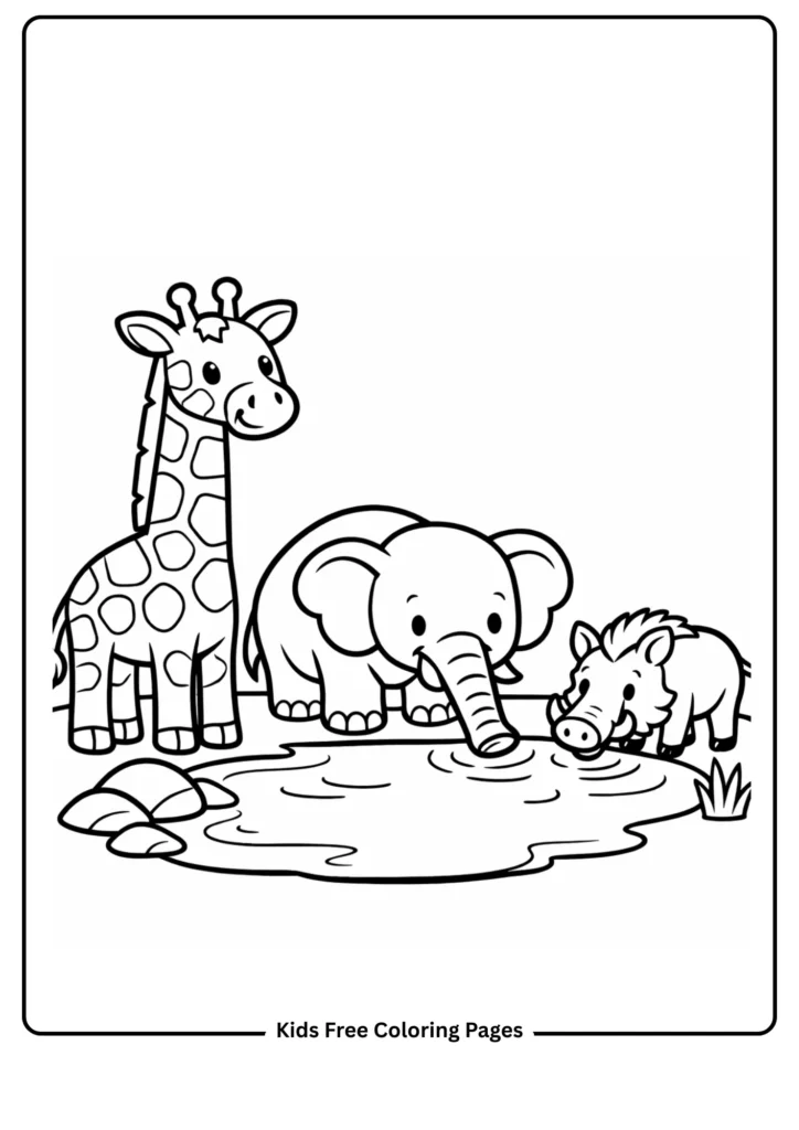 This page shows a giraffe, elephant, and warthog sharing a watering hole, teaching kids about animal communities. The large, simple animals and watering hole are easy to color.