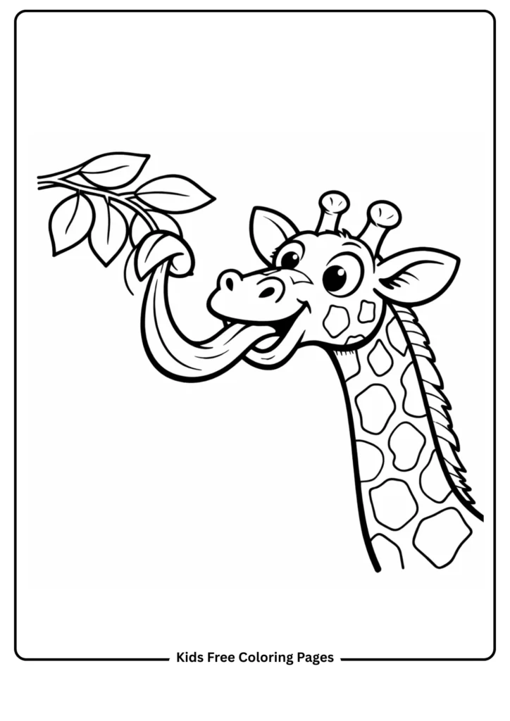 This fun page highlights a giraffe’s long tongue (up to 20 inches!) reaching for leaves. The tongue is exaggerated for humor, and the large leaves are easy to color. Kids learn how giraffes use their tongues to grab branches.