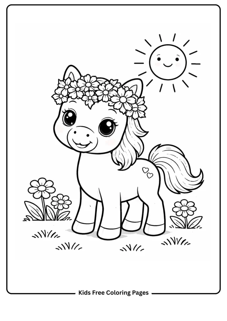 A cheerful pony wears a colorful flower crown while standing under a big smiling sun. The large, rounded body and simple facial features are ideal for young children to fill with bright colors. This page teaches gentle care for animals and appreciation of nature in a fun way. Perfect for developing color vocabulary and encouraging creative expression in preschoolers.