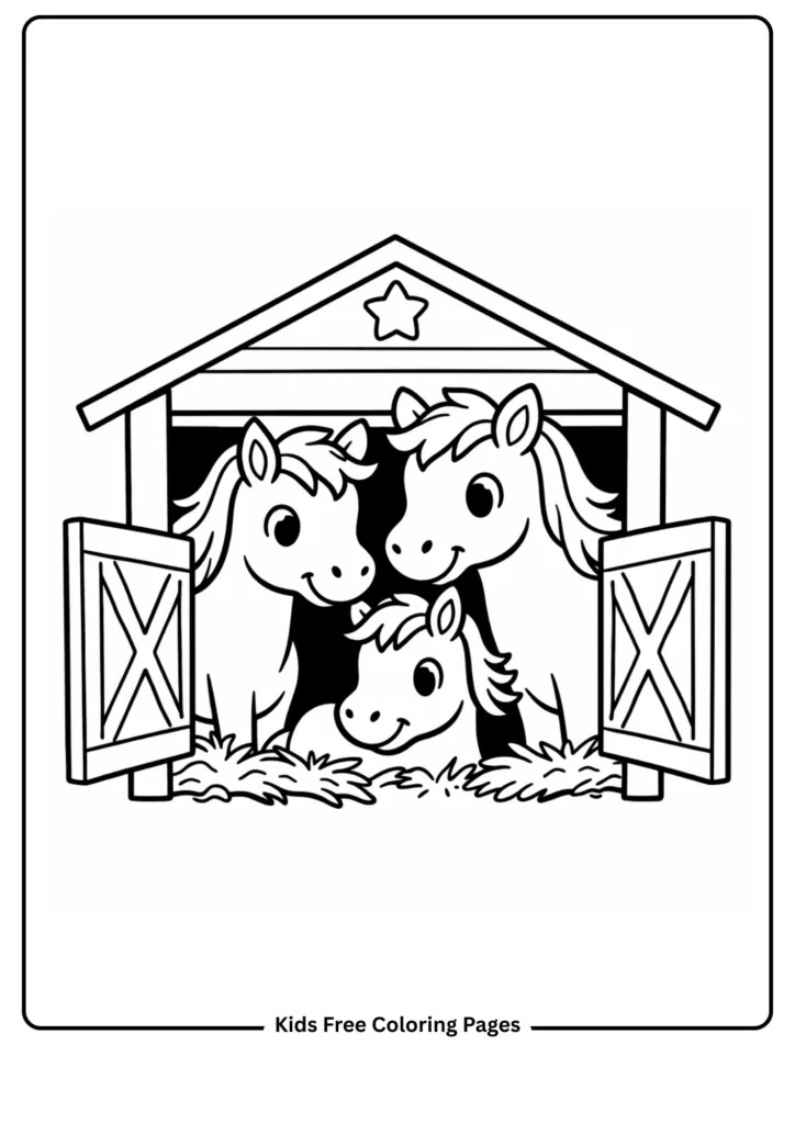 A happy horse family (mother, father, and baby foal) peeks out of a simple barn. The rounded figures and minimal details make coloring easy while introducing family roles and farm life. Perfect for conversations about homes and togetherness.