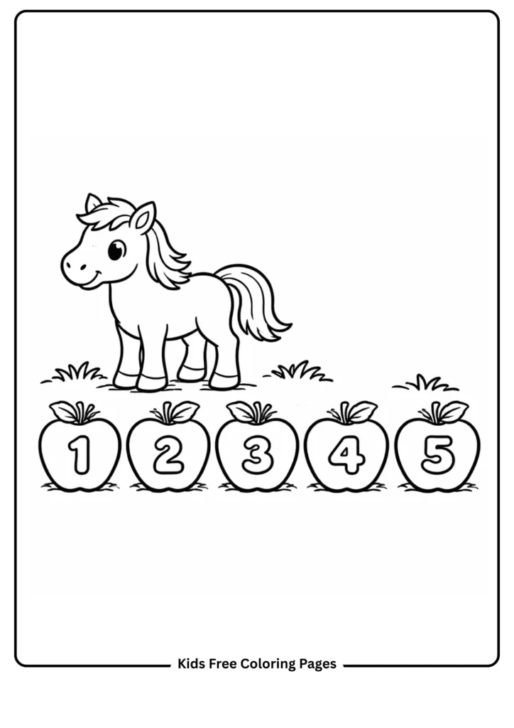 A friendly horse stands beside five large apples arranged in a simple row. This educational page gently introduces counting from 1 to 5 while keeping the focus on fun coloring. Great for early math skills and color recognition in a horse-themed setting.