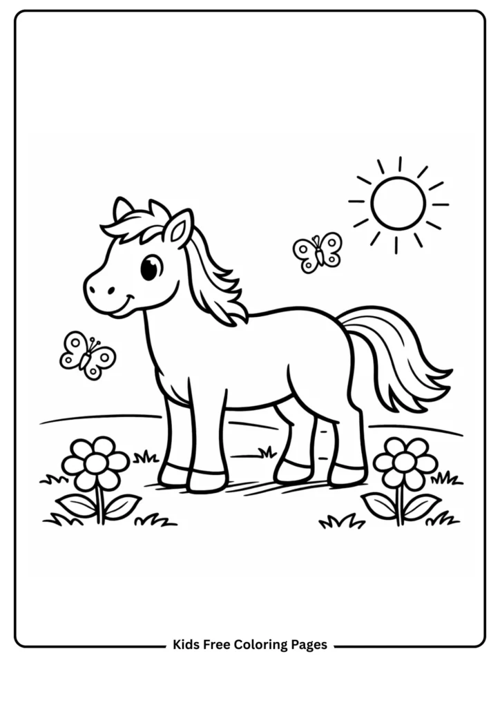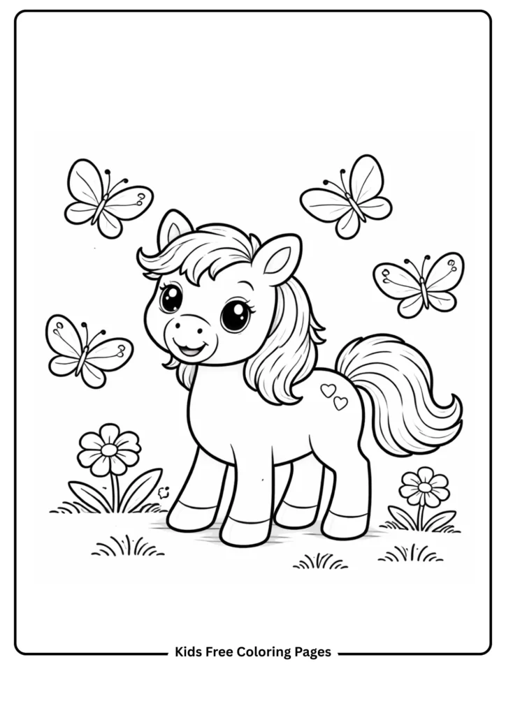 A smiling pony is surrounded by large, friendly butterflies. This page combines horses with nature and insects, helping children learn about friendship and the outdoors. The big open spaces on the pony and butterflies are ideal for bright color experiments.