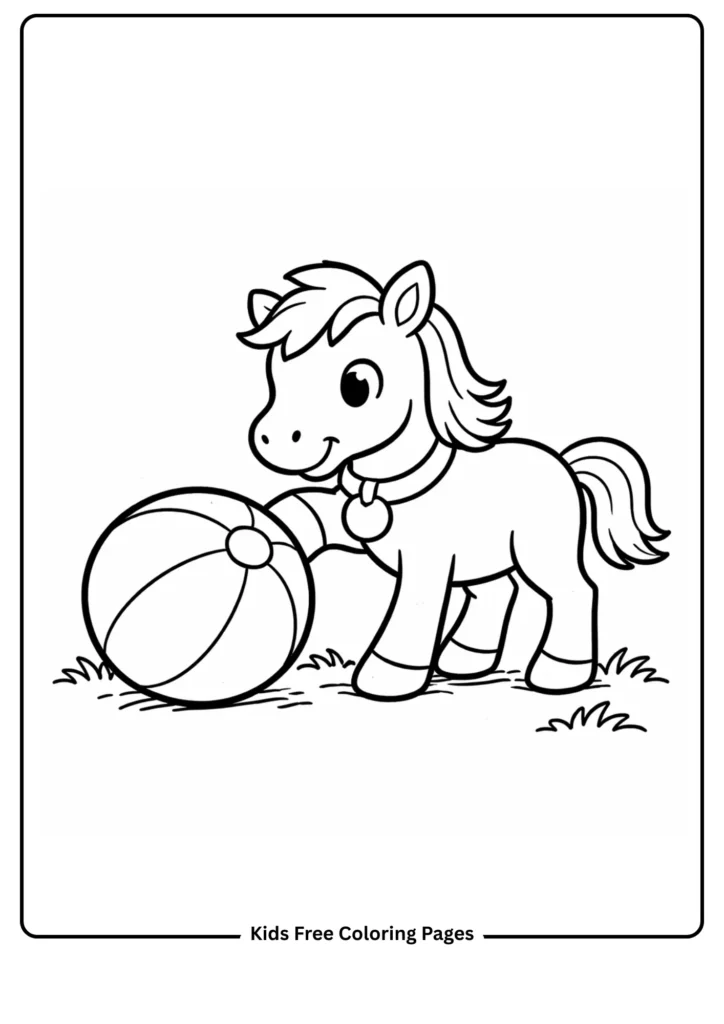 A playful baby foal gently nudges a big round ball. The simple action encourages talk about playtime and movement while the chunky shapes are perfect for toddlers just learning to stay inside the lines.