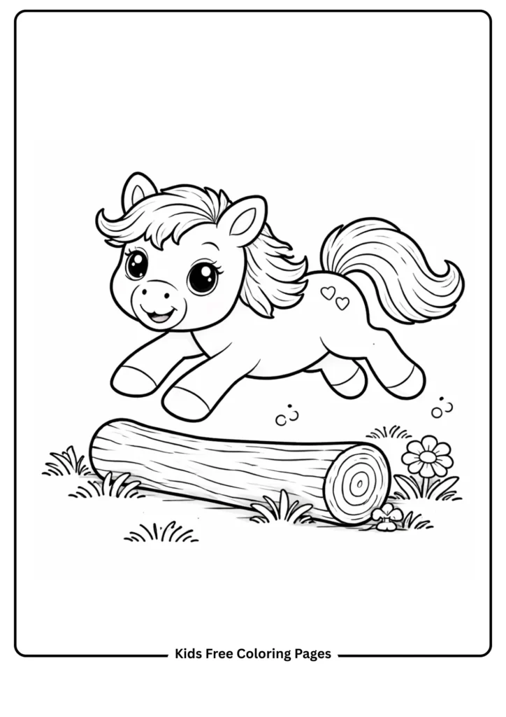 A playful pony jumps over a small log in the field. The action pose uses simple lines to introduce basic movement while keeping everything easy to color. Encourages gross motor ideas and storytelling.