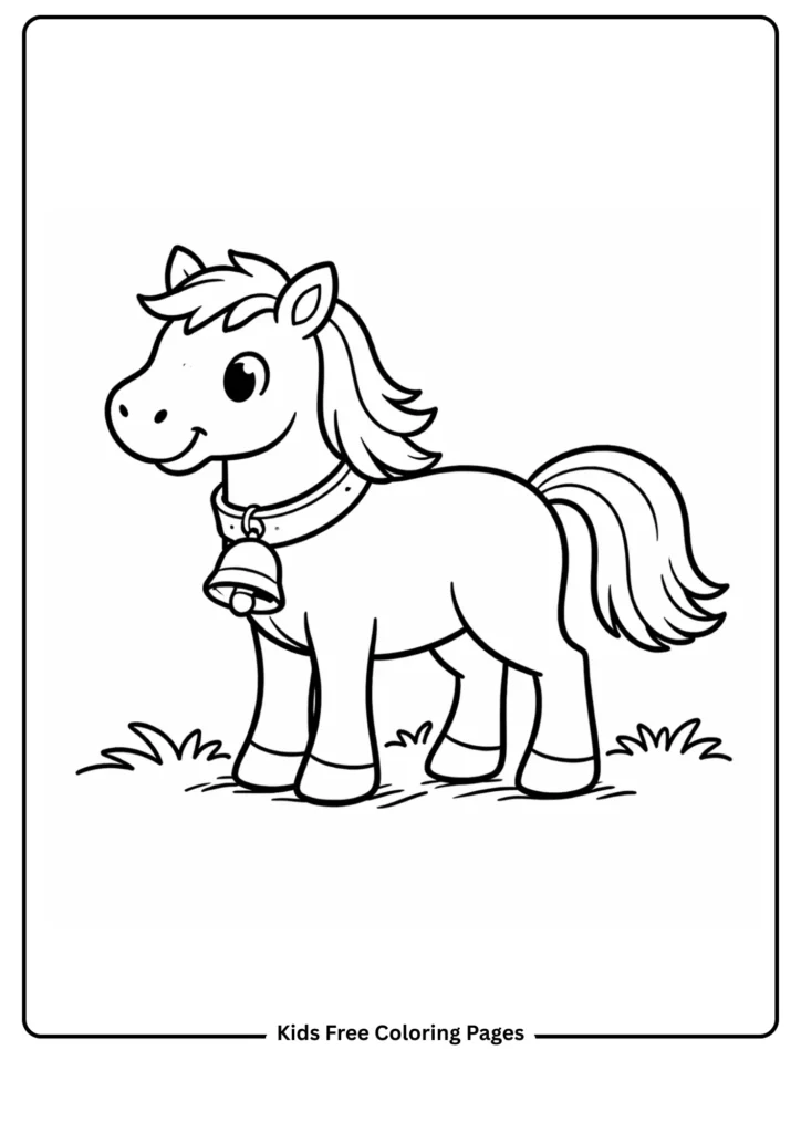 A cute pony wears a simple bell collar and looks very proud. The large collar and bell shapes are easy to color and help children explore sounds and accessories in a gentle way. Perfect for building vocabulary around animal care.