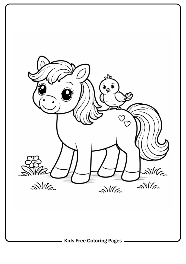 A friendly horse has a small bird perched on its back. This sweet friendship scene teaches about kindness between animals and adds a charming nature element. The large horse body provides plenty of coloring space.