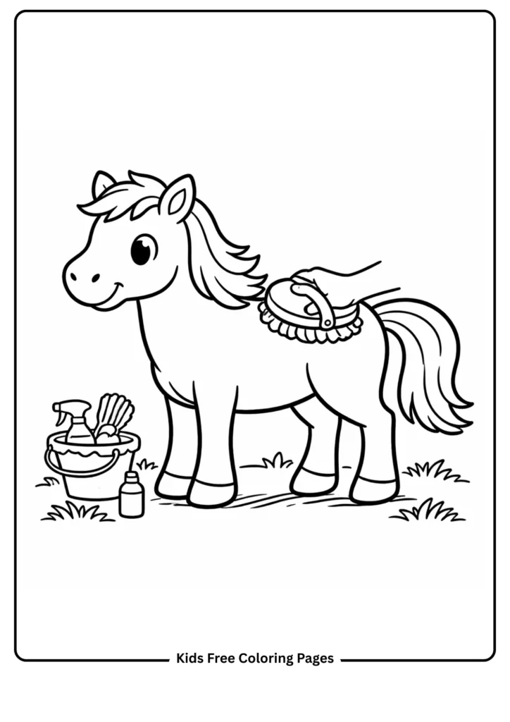 A gentle horse stands still while getting brushed with a simple brush. This sweet scene teaches children about caring for animals and grooming routines. The large, clear shapes are perfect for practicing steady coloring strokes and learning responsibility in a fun, age-appropriate way.