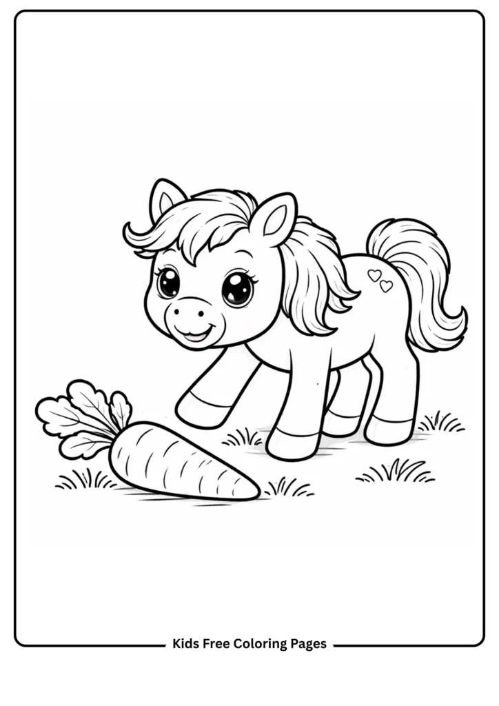 A smiling horse reaches for a big orange carrot. Bold, chunky shapes make this page accessible for beginners while teaching about animal favorites and gratitude. Great for pairing with a real carrot snack activity.
