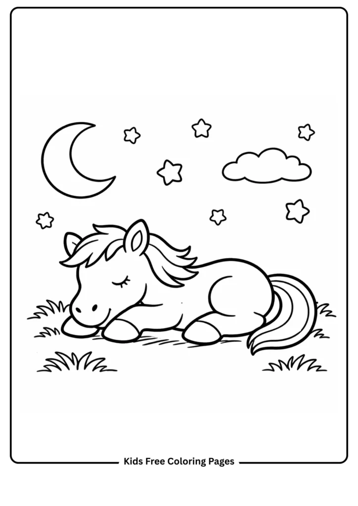 A cozy horse rests peacefully under a night sky with a big crescent moon. The gentle scene helps children explore day and night concepts while practicing soft coloring. A calming page that promotes relaxation before bedtime.