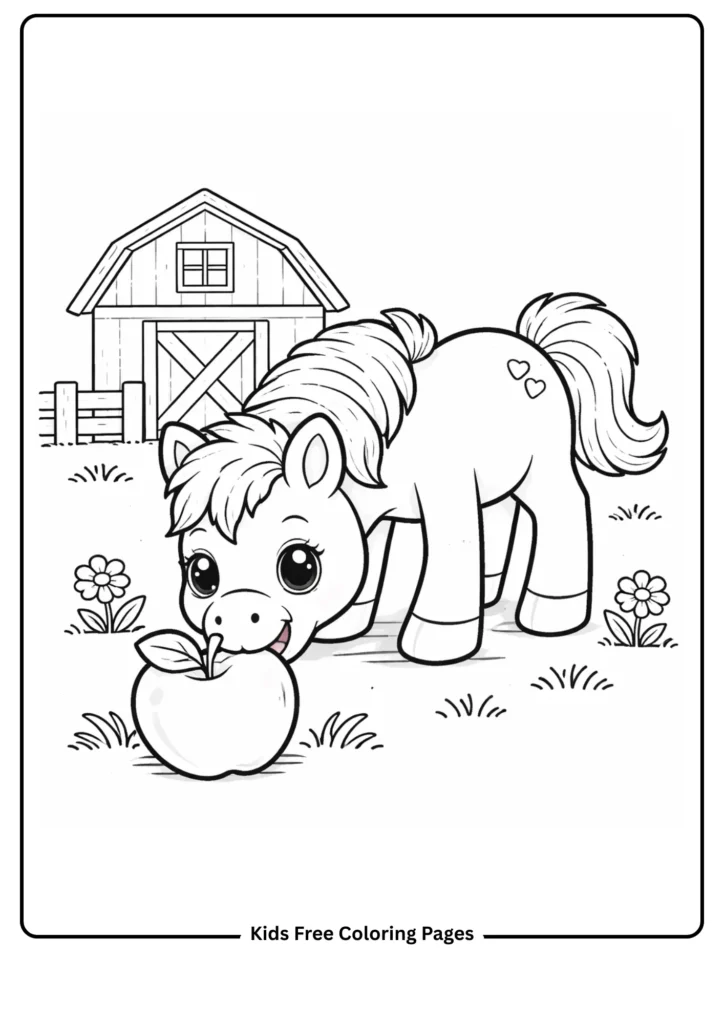 A friendly horse happily munches on a big red apple held by a simple hand or placed on the ground. Bold outlines and chunky shapes help little ones practice coloring while learning about what horses eat. This educational coloring activity promotes healthy eating conversations in a fun, horse-themed way.
