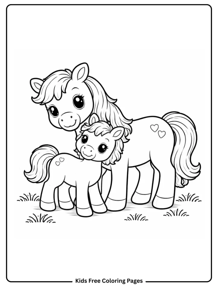 A gentle mother horse stands protectively beside her baby foal in a peaceful pasture. The large, rounded figures and minimal background details make this page easy and heartwarming. It naturally introduces family bonds and animal care, supporting social-emotional learning for young children.