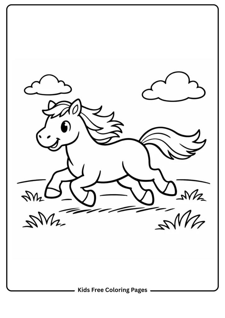 A joyful horse gallops across a grassy meadow with flowing mane and tail. The dynamic yet simple pose uses big, clear lines that are forgiving for little hands. This fun coloring sheet helps children explore movement and nature while building hand-eye coordination. Great for sparking stories about horses running free.