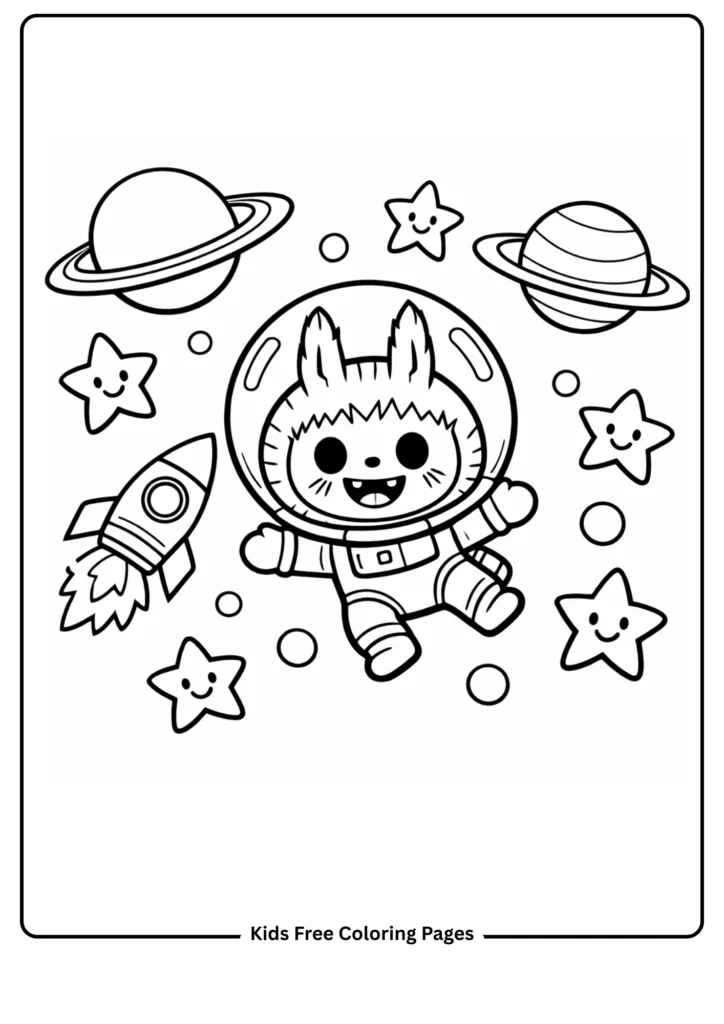 Labubu floats weightlessly in outer space wearing a round bubble astronaut helmet, with an enormous grin visible through the visor. Friendly smiling stars twinkle in every direction while simple planets with bold rings orbit nearby. A cheerful rocket ship trails star-shaped exhaust in the distance. The circular shapes throughout — helmet, planets, stars — give children excellent curved-line coloring practice while fueling curiosity about the universe. Try deep blues and purples for a realistic galaxy look, or go wild with neon rainbow planets and polka-dot rockets for a fantasy space world. Metallic silver and gold crayons add an irresistible cosmic sparkle that kids absolutely love.