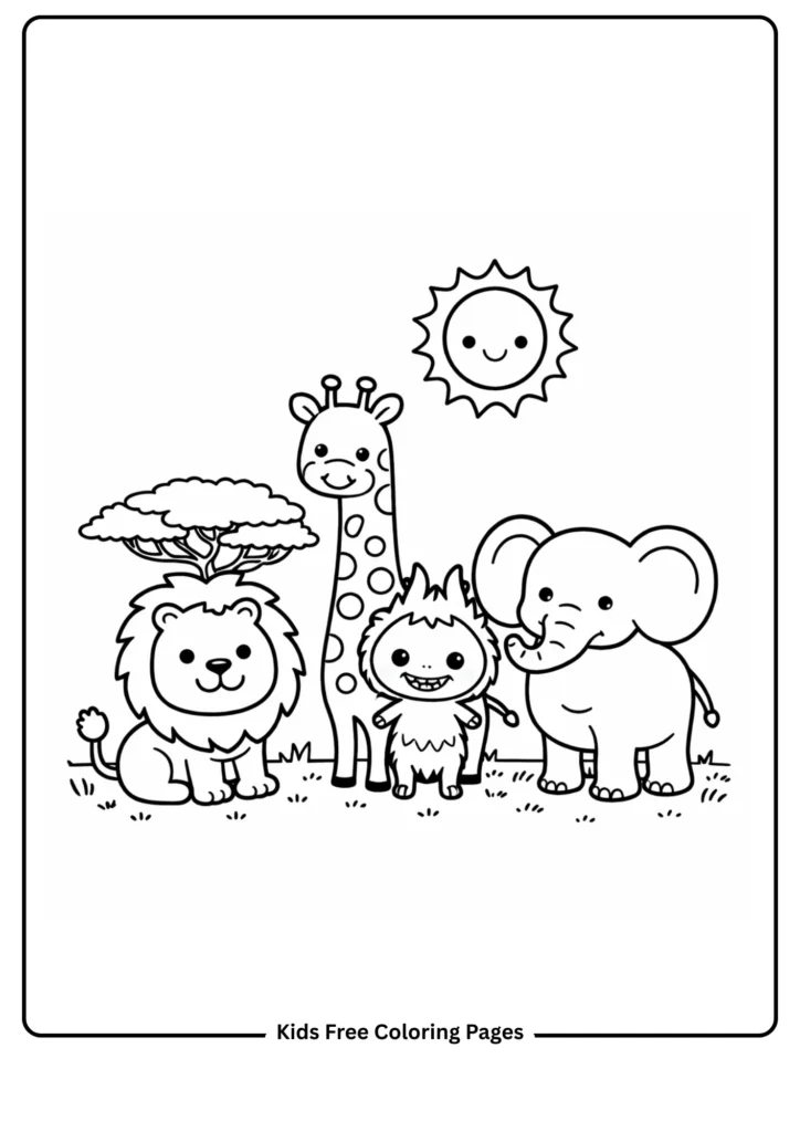 Labubu stands confidently at the center of a sunny savanna alongside a friendly round-featured lion, a tall giraffe with a simple spot pattern, and a gentle elephant with enormous floppy ears. The animal proportions are intentionally simplified and rounded to keep the scene warm and child-friendly rather than intimidating. Minimal background detail — a simple acacia tree silhouette and flat grass line — keeps all attention on the colorful animals. This educational page introduces wild animal identification, African habitats, and safari concepts in a playful way. Children can use realistic earthy tones, or create imaginative polka-dot giraffes and rainbow lions for a creative twist adults won’t expect!