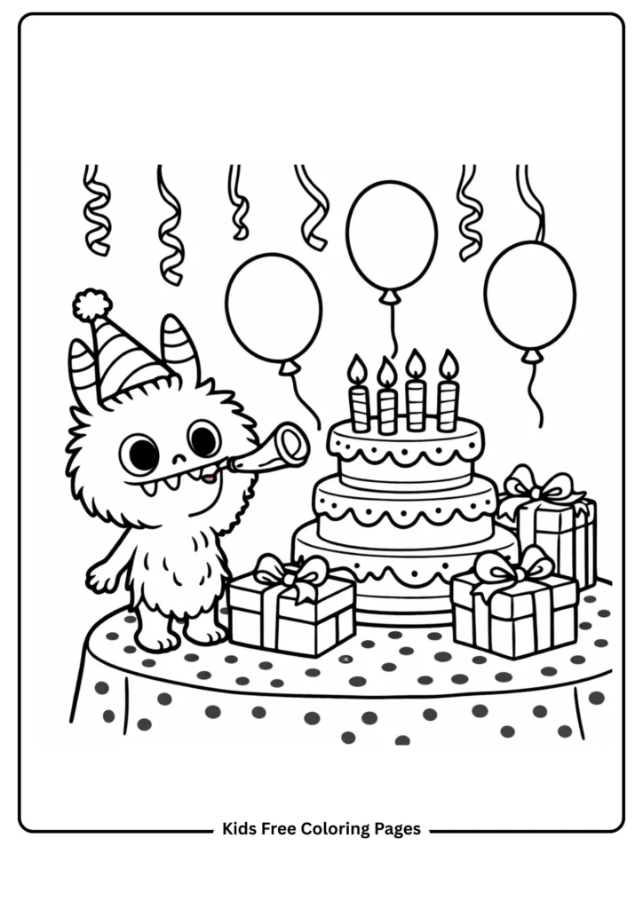 Labubu wears a bright conical party hat and blows an unfurling paper party horn as colorful balloons of various shapes rise around the scene. A large three-tiered birthday cake with candles and frosting drip details occupies the center of a table covered in a dotted tablecloth. Wrapped gifts with bows and ribbons are stacked beside the table while paper streamers hang in swags from above. The scene bursts with celebration energy and is deliberately packed with small coloring details — balloon strings, frosting swirls, ribbon patterns — that reward children who enjoy spending time perfecting each element. This page is an obvious favorite for birthday-themed classroom activities and the perfect card insert for a child’s birthday gift.