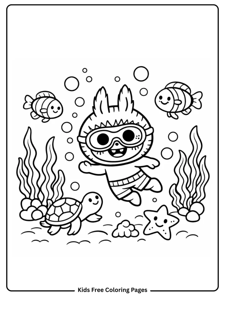 Labubu drifts through a colorful underwater world wearing tiny round swim goggles, surrounded by smiling tropical fish, a friendly slow-moving turtle, swaying seaweed, and a cheerful starfish perched on a coral rock. Large rounded bubbles float upward in clusters, offering excellent small-circle coloring practice. The ocean floor features soft rounded coral shapes and smooth rocks that invite detailed pattern work for older children while staying uncluttered enough for younger ones. This ocean-themed sheet gently introduces marine life vocabulary and sea habitats. Encourage shimmering blues, teals, and greens for a realistic underwater feel — or let children create fantastical fish in neon pinks and yellows!