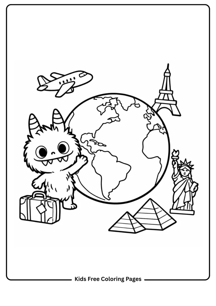 Labubu stands beside a large simple globe showing the outline of the world’s continents, with miniature travel icons floating around it — a tiny airplane, a small suitcase, the Eiffel Tower, a pyramid, and the Statue of Liberty. The globe’s land masses are clearly separated, and children can color each continent a different shade for a geography lesson wrapped in coloring fun. This page sparks natural curiosity about different countries, cultures, and places while making global geography tangible and exciting for young learners. Teachers can use this as a starting point for a ‘countries of the world’ unit or an ‘I want to visit…’ classroom discussion. A perfect companion to an atlas or world map.