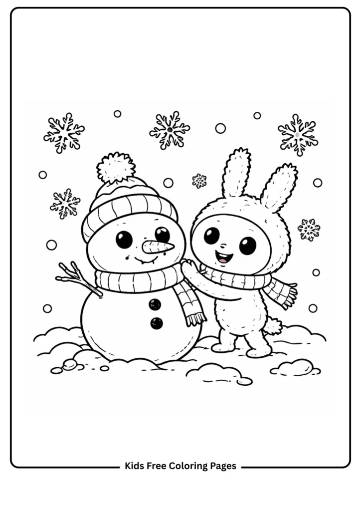 Labubu is bundled up in a cozy oversized scarf and knitted hat while enthusiastically patting together a round snowman. The snowman has a carrot nose, button eyes, and a wide smile — its three ball sections are cleanly separated with thick outlines perfect for small hands. Large soft snowflakes drift in every direction offering charming little coloring details throughout the sky. This seasonal design works beautifully for winter-themed classroom units, holiday craft activities, or simply a calm and cozy afternoon at home. Kids can color bright striped scarves, patterned hats, and even experiment with giving the snow lavender or blue tones. Adding cotton balls glued over the snowman after coloring makes a delightful textured craft extension!
