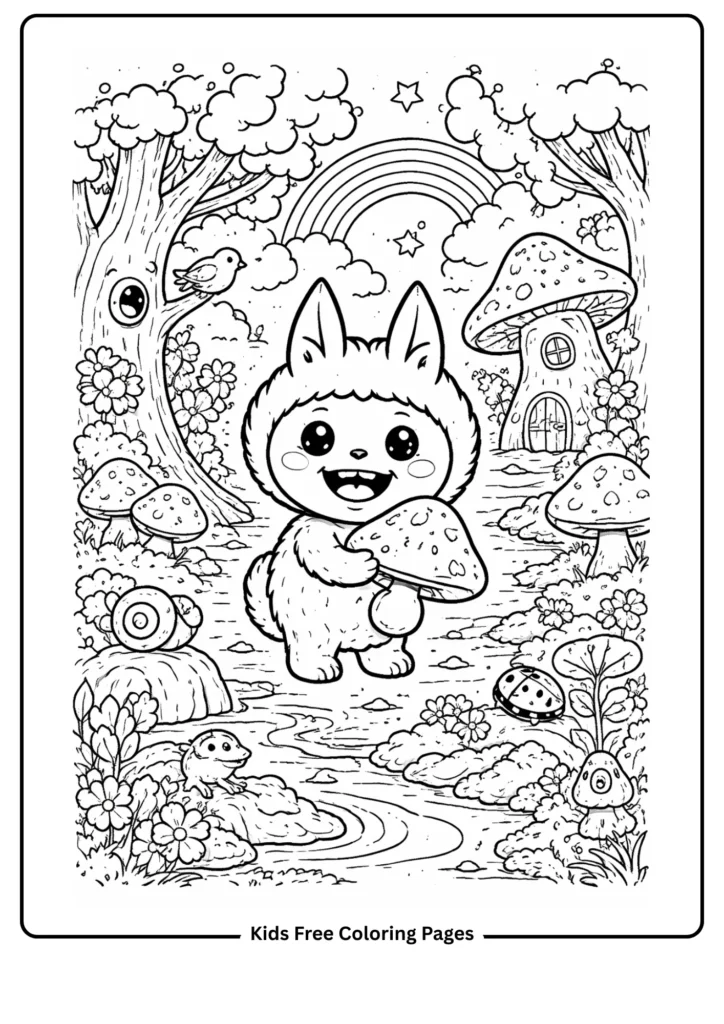 Labubu stands in a magical forest filled with tall rounded trees, giant glowing mushrooms, and friendly woodland animals peeking from behind the leaves. Butterflies flutter above clusters of blooming wildflowers, while soft rolling hills stretch into a gentle background. The large open shapes and bold outlines make this page perfectly approachable for younger children, while older kids can enjoy adding patterns inside the mushroom caps or creating textured bark on the trees. This scene sparks imagination and gently introduces nature concepts like forest habitats, insects, and woodland life. Try painting the trees in rainbow shades, using pastel colors for the mushrooms, or giving the butterflies symmetrical wing patterns for a beautiful challenge. Glitter crayons make the forest feel truly enchanted!